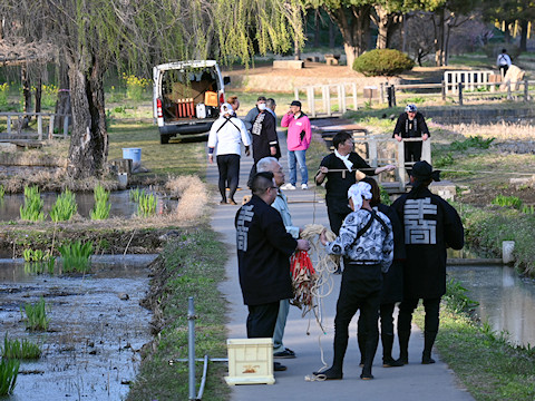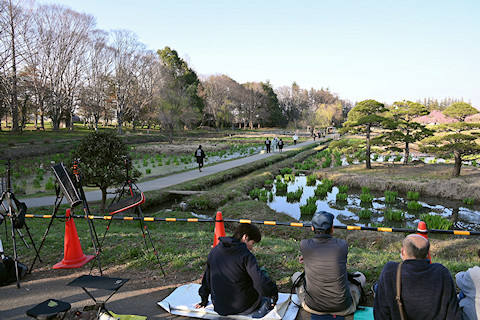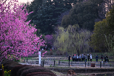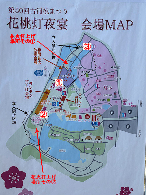 | 今回は古河公方公園で開催された古河桃まつりを訪問。2週間ほどのまつり開催期間中のうち1日は手筒花火やスカイランタン、花火打上げがあるとのことで、これらを観覧するのが目的です。初めての観覧、ネット上で観覧記などを見つけることができず、詳細な情報がわからない。過去の動画を見ると花火打上げ時間は5分ほどのようなので、そこまで早く訪問しても時間がもったいないかと思い、手筒花火が18:00、花火打上げが18:30開始に対し、現地に到着したのは15:30過ぎ。 しかし、手筒花火が行われるカキツバタ園を見渡せるメインステージ裏の通路にはすでにびっしり三脚やレジャーシートが敷かれていている。無理をすればレジャーシートが敷かれている後ろに三脚を立てることもできましたが、それだけ通路を狭くしてしまうことになるので、別の観覧場所を探すため会場内をさまようことに。 |