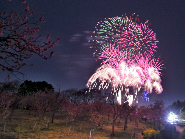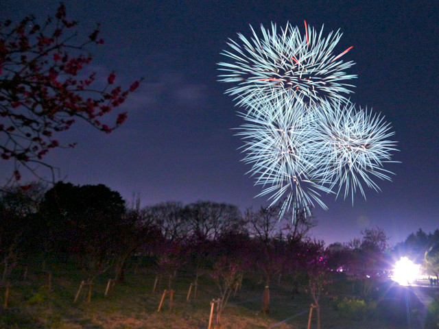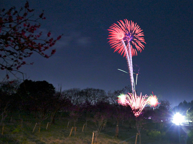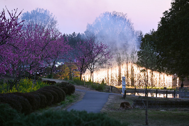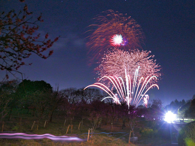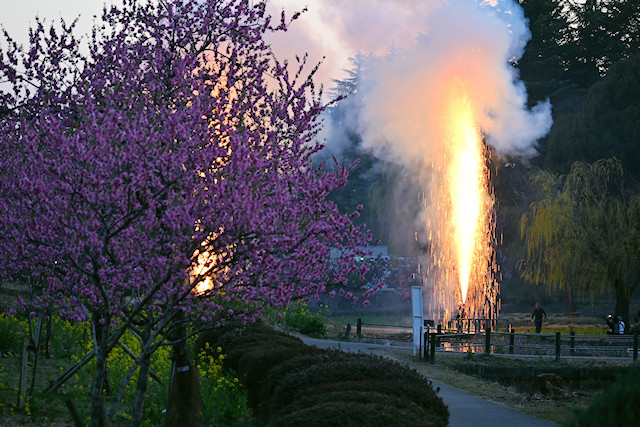 | 苦しまぎれで観覧場所に決めたのは公園の北側の桃林(会場図の③と記した場所)。桃の木の合間から手筒花火が遠目に見えるし、スカイランタンと花火打上げ場所が一直線になる。桃の木に高さがあるので難しいかもしれないけれど、ワンチャンスカイランタンが見えるかも? スカイランタンが見えなくても桃の木と花火のコラボが撮影できるかな。 前方の立入禁止区域内には警備スタッフが立っていて、往来する来場者には「ここからは手筒花火は遠くて背を向けて手筒花火をするので、正面にまわった方がいい」と声掛けするので、私の周囲は誰もいない。もちろん三脚を立てているのは私ひとりだけの状態で18時の手筒花火を迎える。まずはナイアガラ富士の仕掛けが披露され、続いて手筒花火が行われる。手筒花火は2人ずつが並んで披露され、交代しながら進行。全員の手筒花火が終わると、その場所で打上げ花火が打ち上げられました。最初、スタッフが言っていた打上げ花火はこのことを言っていたんだな。手筒花火は手持ちの200ミリの望遠レンズだったので、いきなりの打上げに驚きつつも24ミリまで引いたけれど、それでも収まりきらない画角でした。 |