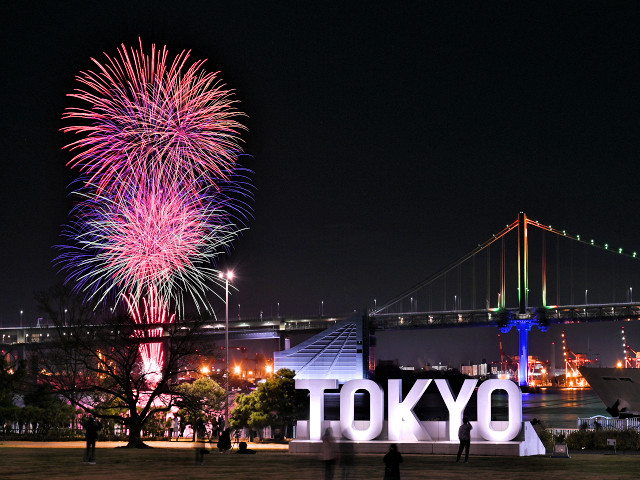 | 花火はほぼ想定どおり、レインボーブリッジの橋脚の左側から打ち上がる。直線距離で2㎞以上離れていて、レインボーブリッジを挟んだ向こう側から打ち上がるので、地上付近の小型煙火はあまり見えない。また、花火を斜め方向から見るかたちになるので、扇状に広がるトラもワイド感は小さいけれど、STAR ISLANDなどのように複数の台船を使用した打上げ構成ではないので問題なし。今年仕入れた電熱ベストや電熱グローブなどを持ち出して最大限の防寒をしてきましたが、風もなく電源を入れてるまでもなく寒さに震えることもありません。その分、煙のはけも悪く花火が少し見づらかったけれど、花火とレインボーブリッジ、TOKYOモニュメントの組み合わせは狙いどおり。今年最後の花火も満足いくものでした。 | |