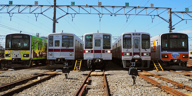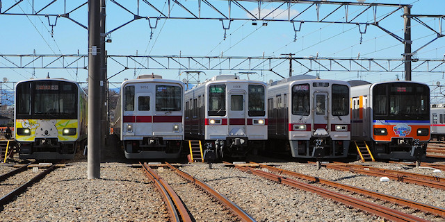 | こちらは近景撮影タイムで5編成を撮影したもの。架線柱も入らず、中央の10000系11031編成を正面にして撮影できました。近景撮影とはいっても車両の目の前まで近づくわけでもなく、28ミリで5編成が収まるくらいの間合いでした。 | |