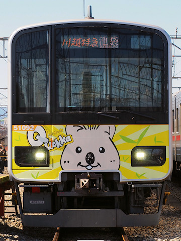 | 昨年の車両撮影会は事前応募制ではなく、時間帯によって全景撮影(遠くから撮影)、近景撮影(車両に近づいて撮影)タイムとなっていました。行列に並びさえすれば誰だも撮影会に参加できるのがメリットですが、長時間の待ち時間が必要となること。たとえば全景撮影したいけれど、列の先頭になった時間帯が近景撮影タイム中であった場合は近景撮影しかできず、思いどおり撮影ができないなどのデメリットもありました。 今年の車両撮影会は事前応募制となり、10:00〜10:30が東武ツアー参加者向け。10:30〜12:00と12:30〜14:30は15分刻みに一般枠。12:00〜12:15が株主招待枠。12:15〜12:30はとーぶキッズ招待枠に割り当てられていました。15分のうち前半は全景撮影タイム、後半は近景撮影タイムと東武系イベントではおなじみのスタイル。一般枠の1回あたりの収容人数は200人なので、ほぼほぼ自分の思いどおりの構図で撮影できるくらいの混み具合といったところでしょうか。 上の写真は全景撮影タイム中に撮影したもの。50092型(クオッカトレイン)と9000型の間の架線柱を避けて5編成を撮影しようとすると、9000型の正面あたり撮影するしかなかったので、この1枚だけを撮影して後半の近景撮影タイムを待ちます。 |