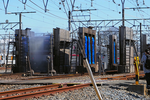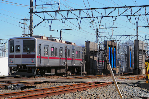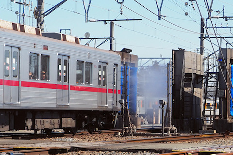 | 車両撮影会を出て歩いていると11:10発の車両洗浄機体験の列車が通過していたのでしばし見学。9051編成が担当していました。 | |