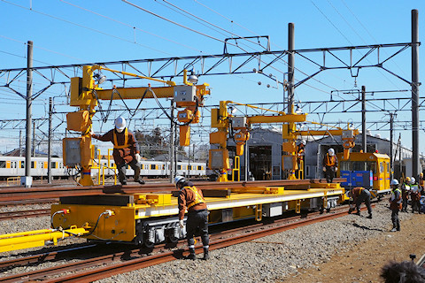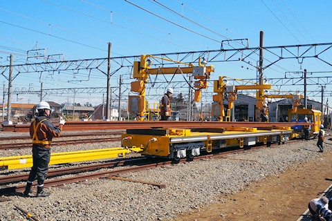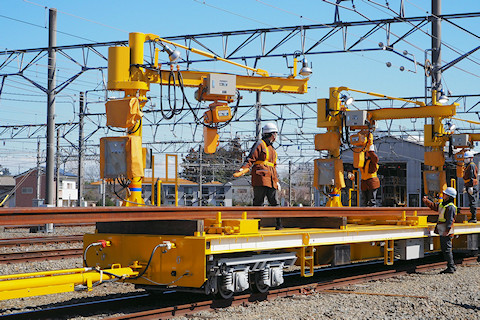 ![]() レールをクレーンに取り付け持ち上げられ… |